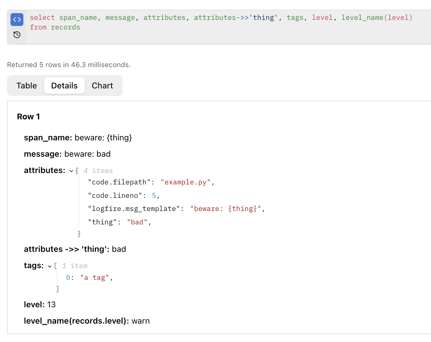 You can query it using the ->> operator, e.g. above attributes->>'thing' = 'bad' (note the single quotes, "thing" or "bad" would look for SQL columns with those names and fail) would match our record because of the thing='bad' argument in the logfire.warn() call. For nested JSON, you can chain multiple ->> operators, e.g. attributes->>'nested'->>'key'. You can also use -> which is mostly interchangeable, but if you get weird errors about types, try using ->> instead.